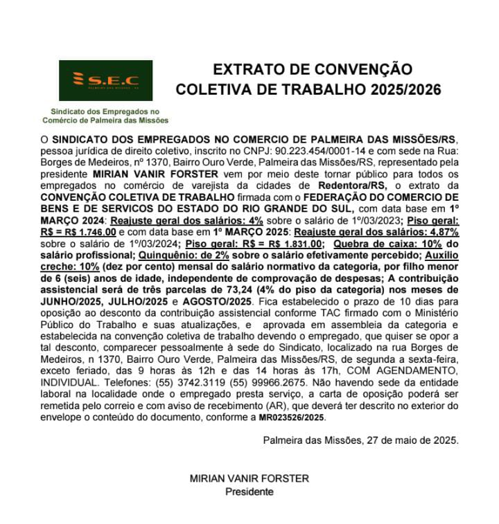 NOS DO SINDICOMERCIARIO PALMEIRA DAS MISSÕES, DEPOIS MUITO TEMPO LUTANDO PARA FECHAR A CONVENÇÃO COLETIVA DA CIDADE DE REDENTORA, TEMOS UMA GRANDE NOTICIAS!