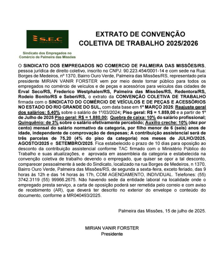 O Sindicomerciários de Palmeira das Missões informa que foi concluída com sucesso a negociação da nova Convenção Coletiva de Trabalho com o SINCOPEÇAS (Sindicato do Comercio de veículos usados e de peças e acessórios para veículos no estado do Rio Grande do Sul).